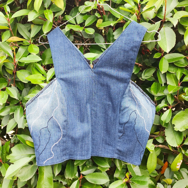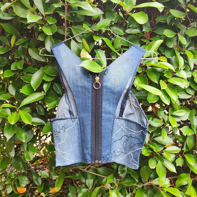Transformé à partir d’une chemise en jean, ce bustier incarne l’art de l’upcycling. Après un processus minutieux de démontage, moulage, patronage et assemblage, elle a été sublimée par une broderie entièrement réalisée à la main.