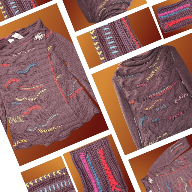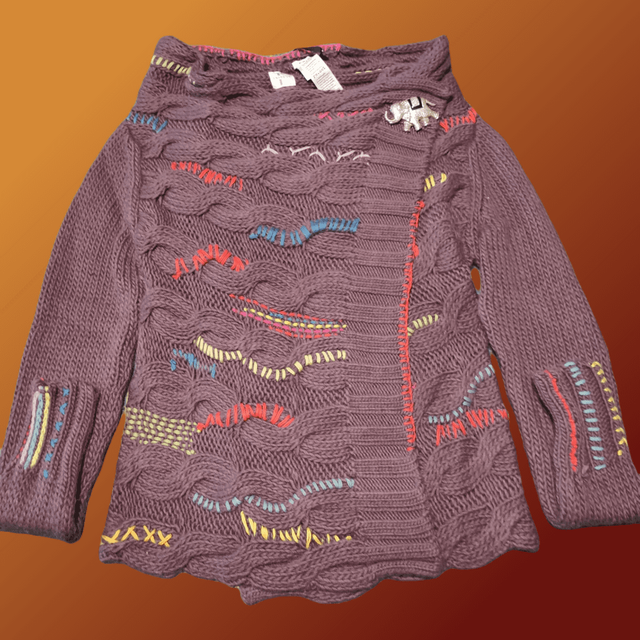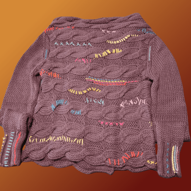 Upcycling d’un gilet en 100% laine baby alpaga, revisité avec soin pour lui offrir une seconde vie pleine de style et de caractère. Ce vêtement est sublimé par des broderies créatives aux couleurs vives, réalisées entièrement à la main, qui lui confèrent une identité forte et expressive.