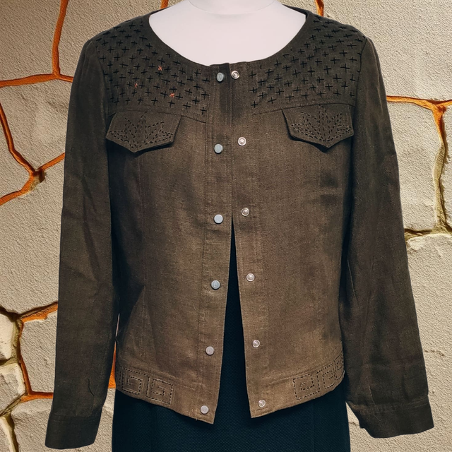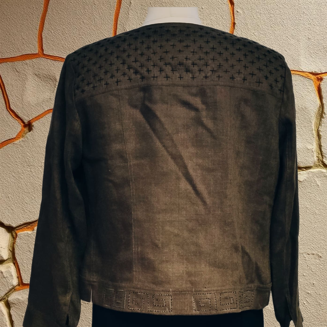 Veste upcyclée à partir d’un modèle de la marque LINEA T by ZAPA, transformée avec soin pour devenir une pièce unique au style affirmé. Chaque détail a été repensé et sublimé par des broderies réalisées entièrement à la main, apportant une touche artistique et singulière à cette création.