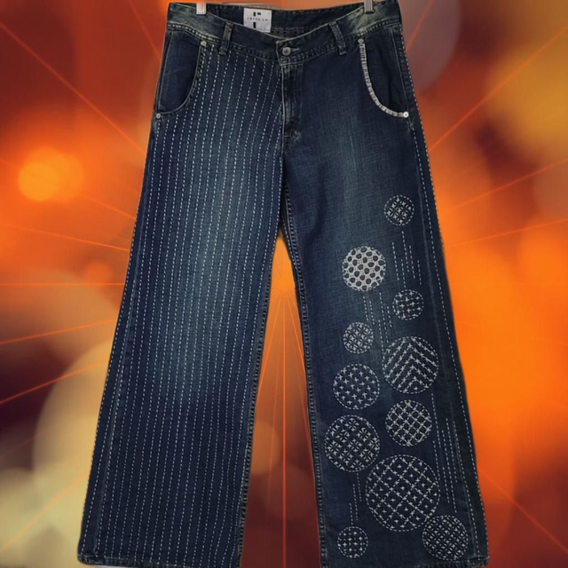 Les broderies réalisées selon la technique japonaise du sashiko apportent à ce jean une touche stylée, tout en conservant un look décontracté et affirmé. Chaque point est pensé pour valoriser l’existant et lui offrir une nouvelle expression.