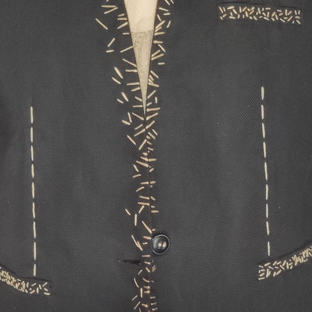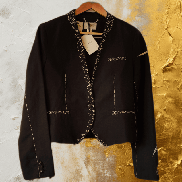 Travaillée à partir d’une veste Cyrillus, EWEN est doublée pour garantir un confort optimal tout en conservant une silhouette sophistiquée. Les broderies, inspirées des techniques traditionnelles et contemporaines, transforment cette pièce en un vêtement unique où savoir-faire et créativité se rencontrent.