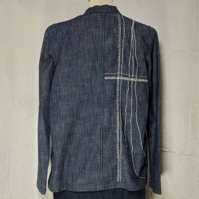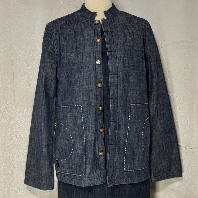 Cette veste upcyclée est une création originale inspirée du style chinois traditionnel, sublimée par des broderies sashiko réalisées à la main. Chaque point reflète un savoir-faire artisanal et une volonté de donner une seconde vie aux textiles.