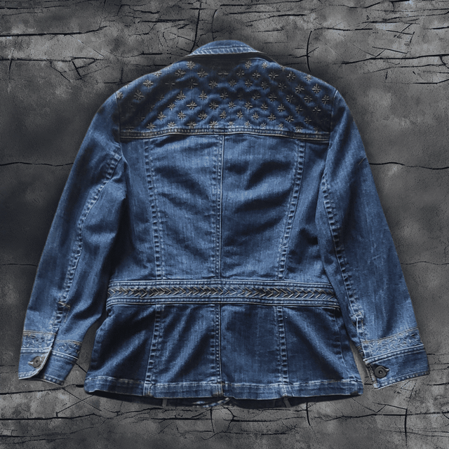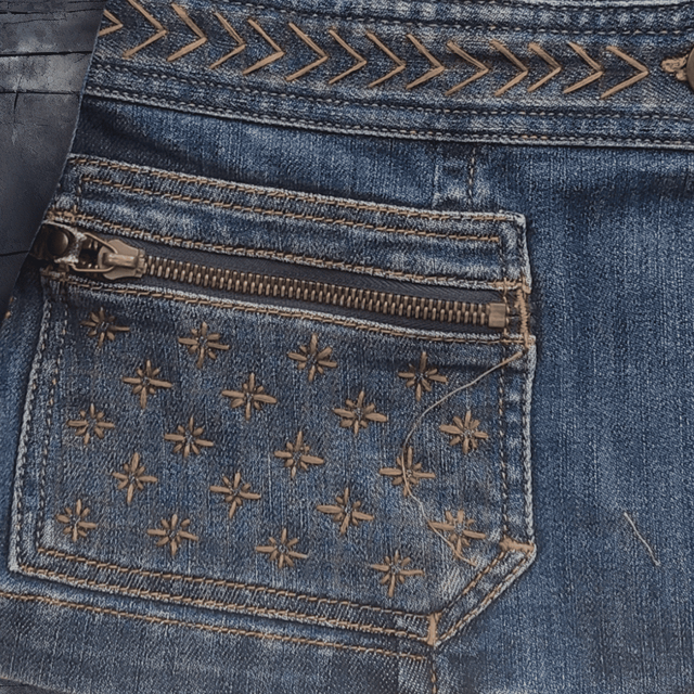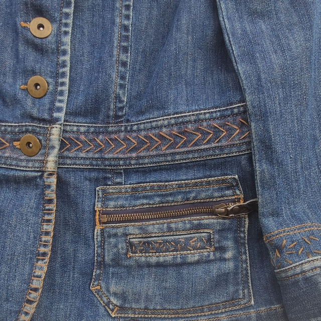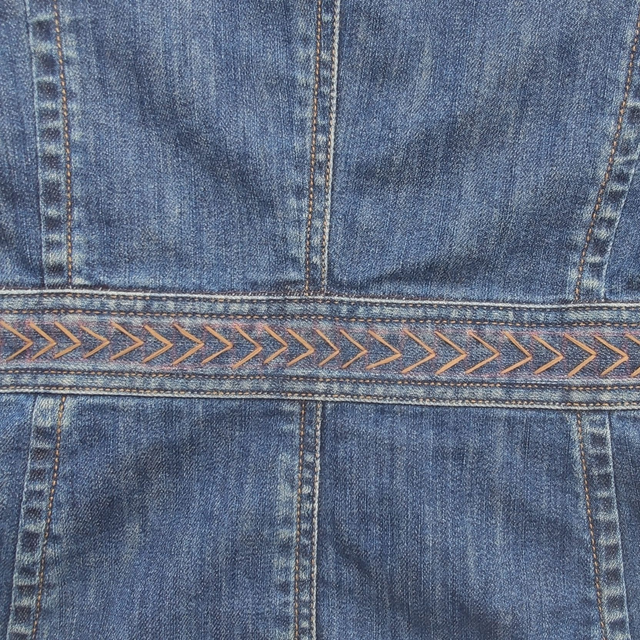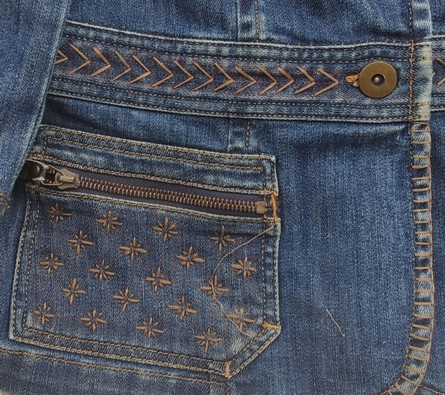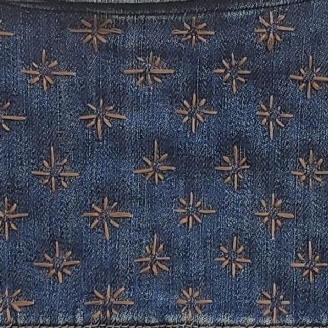 Les broderies selon la technique du sashiko lui confèrent un style unique et original. En plus d'être mode, elle s'inscrit dans une démarche d'économie circulaire incontournable en utilisant des matériaux recyclés.