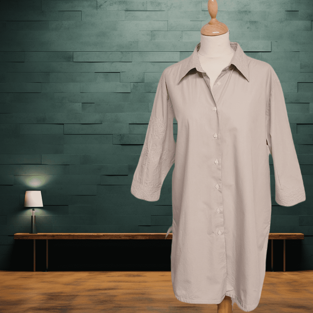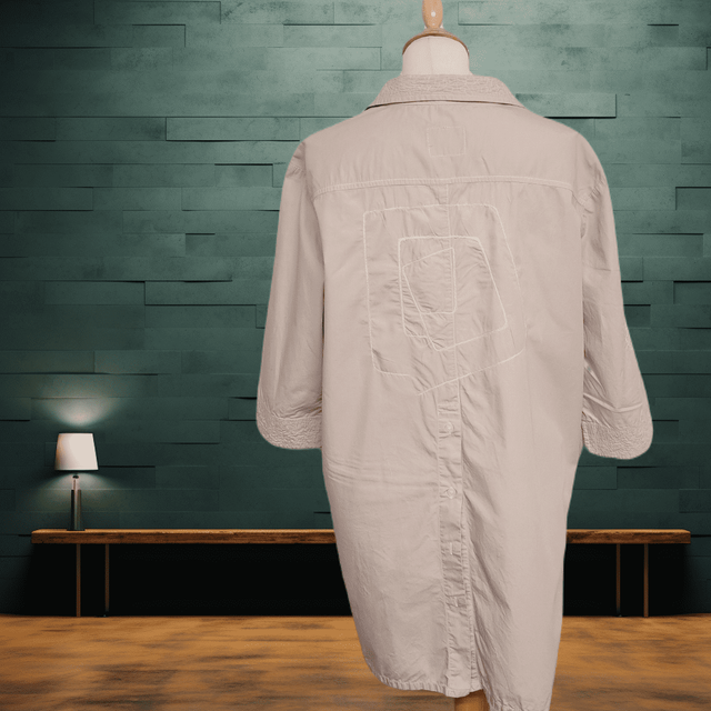 Cette chemise upcyclée aux tonalités tourterelle et blanche apporte une touche d’originalité et de singularité à votre garde-robe. Chaque détail a été pensé avec soin pour créer une pièce unique, qui célèbre l’art du travail manuel et l’histoire textile.