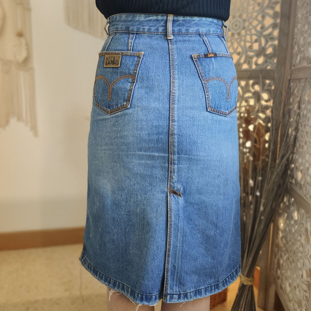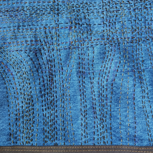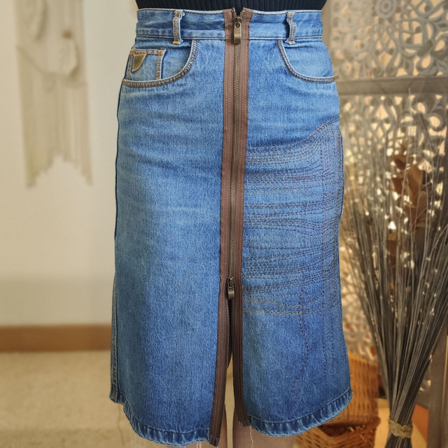 Cette jupe en jean revisitée est une création originale signée FRING'UP, conçue à partir d’un modèle de la marque Loïs. L’ourlet a été décousu, le zip classique remplacé par un double zip séparable sur toute la longueur, et des broderies esprit sashiko ont été ajoutées sur le côté pour une touche artisanale et graphique.