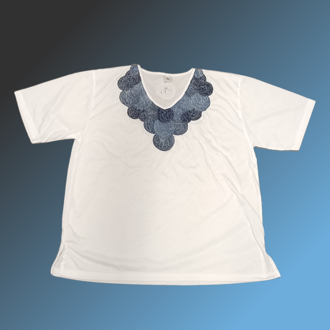 Ce haut en coton a été métamorphosé en une pièce singulière, sublimée par des patchs en denim qui ornent le tissu tel un bijou délicatement posé. L’upcycling permet de donner une seconde vie à des vêtements anciens, réduisant ainsi notre empreinte environne mentale.